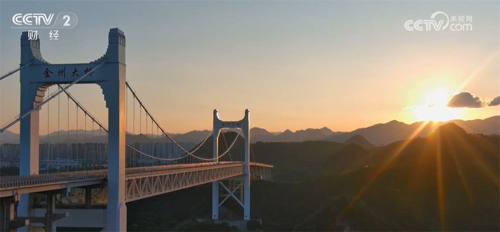 金州大橋位于貴州興義市,是貴州首座設(shè)有城市軌道交通空間與旅游觀光通道的懸索橋?!皹蚺再p落日、橋上瞰山河、橋下觀飛瀑”的立體化旅游新模式,吸引了眾多游客和市民前來觀景游玩。