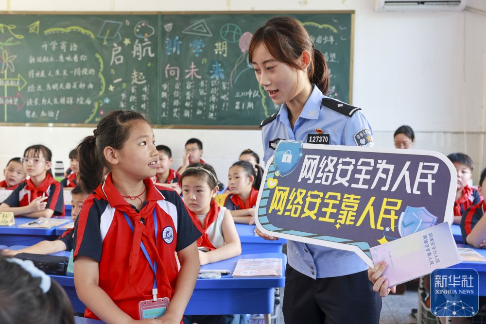 9月15日,在江蘇省泰興市襟江小學(xué)教育集團(tuán)佳源校區(qū),泰興市公安局城北派出所民警通過(guò)互動(dòng)方式在給學(xué)生講解網(wǎng)絡(luò)安全知識(shí)。新華社發(fā)(顧繼紅攝)