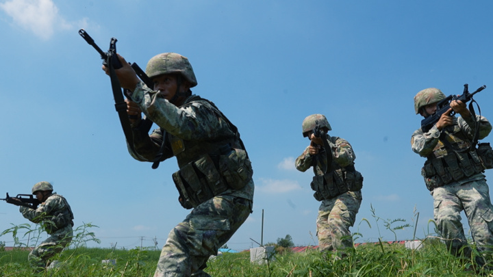 烈日灼人,汗水混雜著泥土粘在作訓(xùn)服上。但戰(zhàn)士們一絲不茍,目光如炬,動作凌厲,搜索、突擊、越障、匍匐……一舉一動彰顯著人民軍隊(duì)的凜然軍威與中國軍人的過硬本領(lǐng)。?