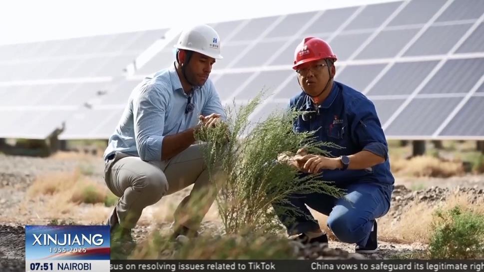 外籍主持人林肯探訪了全球最大的“草光互補”光伏基地——阿合雅光伏產(chǎn)業(yè)園。這片由181萬塊光伏板組成的藍色海洋,占地493公頃,相當于700個標準足球場。不僅能夠提供滿足約43萬人全年用電需求,還兼具治沙功效。中國華能集團烏什光伏電站負責人周博表示,這類光伏設施能夠穩(wěn)固土壤、防止侵蝕,板面凝結(jié)的水珠還可灌溉下方土地,支持植物持續(xù)生長?!案瓯谄孥E”的背后,是國家實現(xiàn)“雙碳”目標而推動的生態(tài)與能源的“雙向奔赴”。
