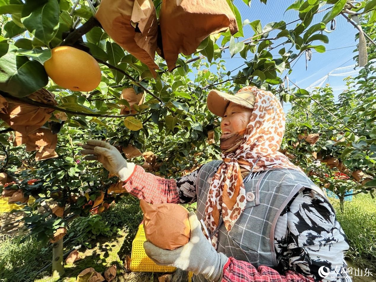 左彥玲正在采摘自家地里的秋月梨。人民網(wǎng) 喬姝 攝