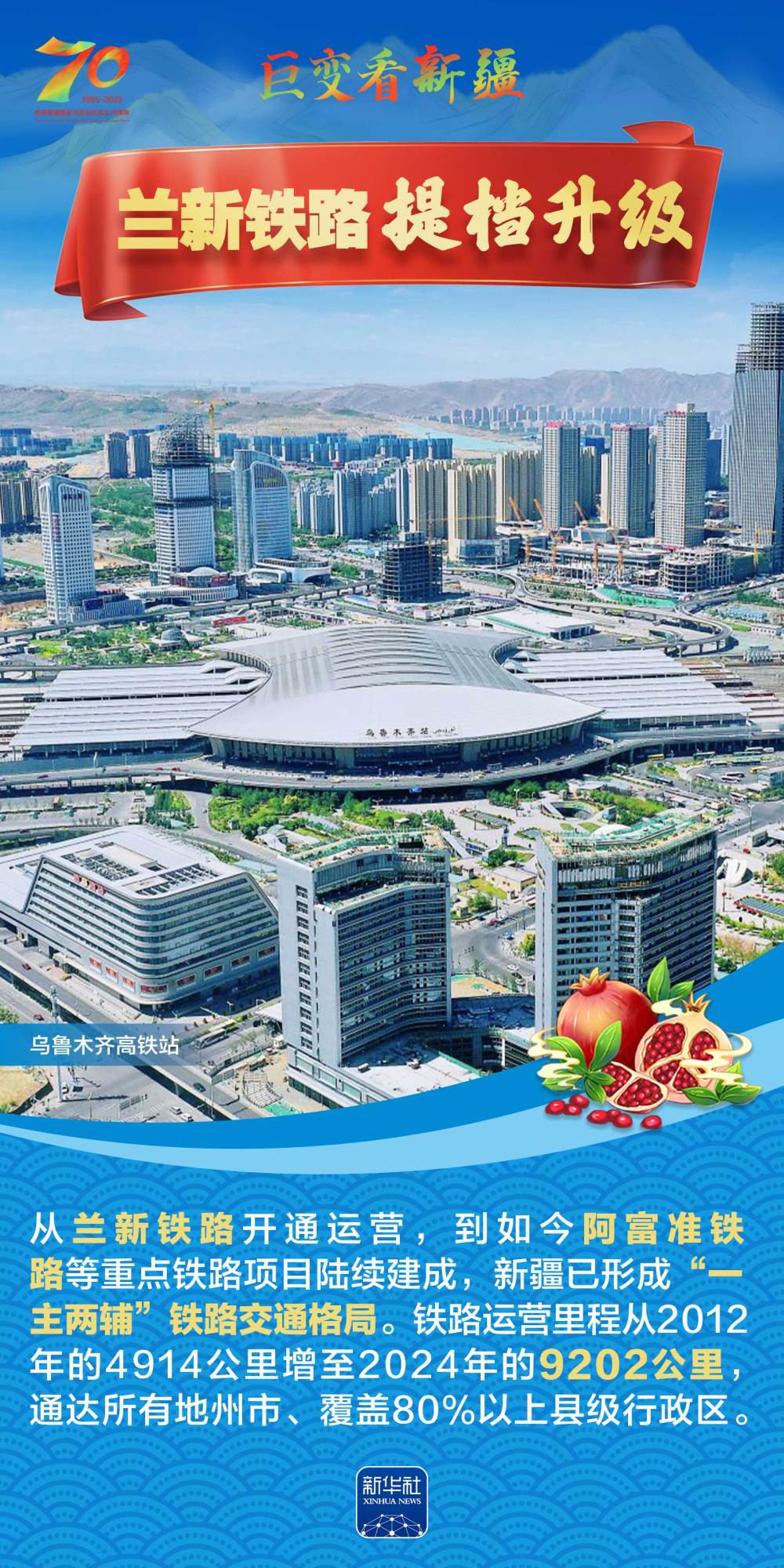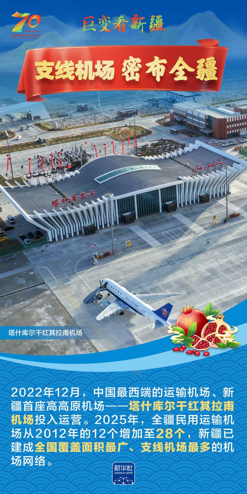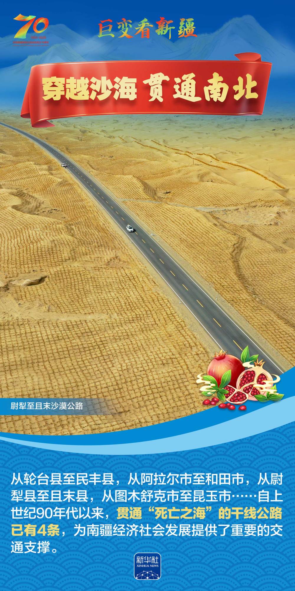 今年是新疆維吾爾自治區(qū)成立70周年。70年來(lái),新疆的交通建設(shè)日新月異。從駝鈴聲聲、馬蹄嘚嘚到鐵流縱橫、銀鷹高翔,一座座交通樞紐輻射四方,一條條“鋼鐵巨龍”蜿蜒逶迤,一個(gè)個(gè)支線機(jī)場(chǎng)星羅棋布,現(xiàn)代化的新疆立體交通網(wǎng)絡(luò)日益形成。讓我們跟隨這組海報(bào),一起見證穿越“三山兩盆”、貫通歐亞大陸的新時(shí)代新疆交通畫卷。