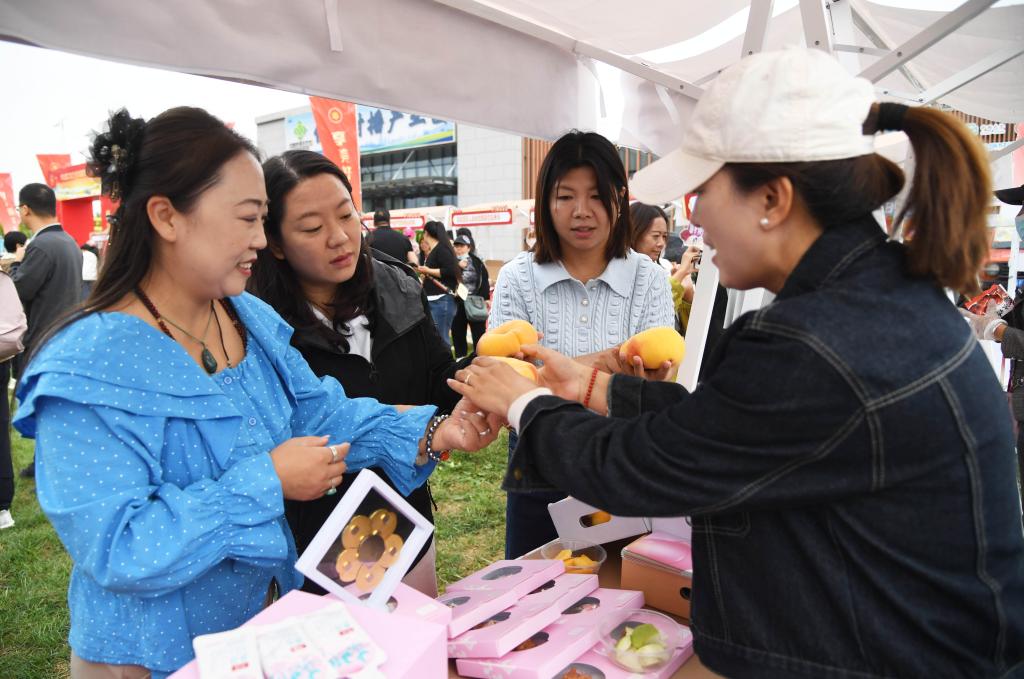 9月19日,北京市平谷區(qū)舉辦2025年中國(guó)農(nóng)民豐收節(jié)暨第36屆北京農(nóng)民藝術(shù)節(jié)“鄉(xiāng)村大舞臺(tái)”平谷區(qū)專場(chǎng)展演。工作人員(右一)在活動(dòng)現(xiàn)場(chǎng)向市民介紹農(nóng)產(chǎn)品。新華社記者 任超 攝