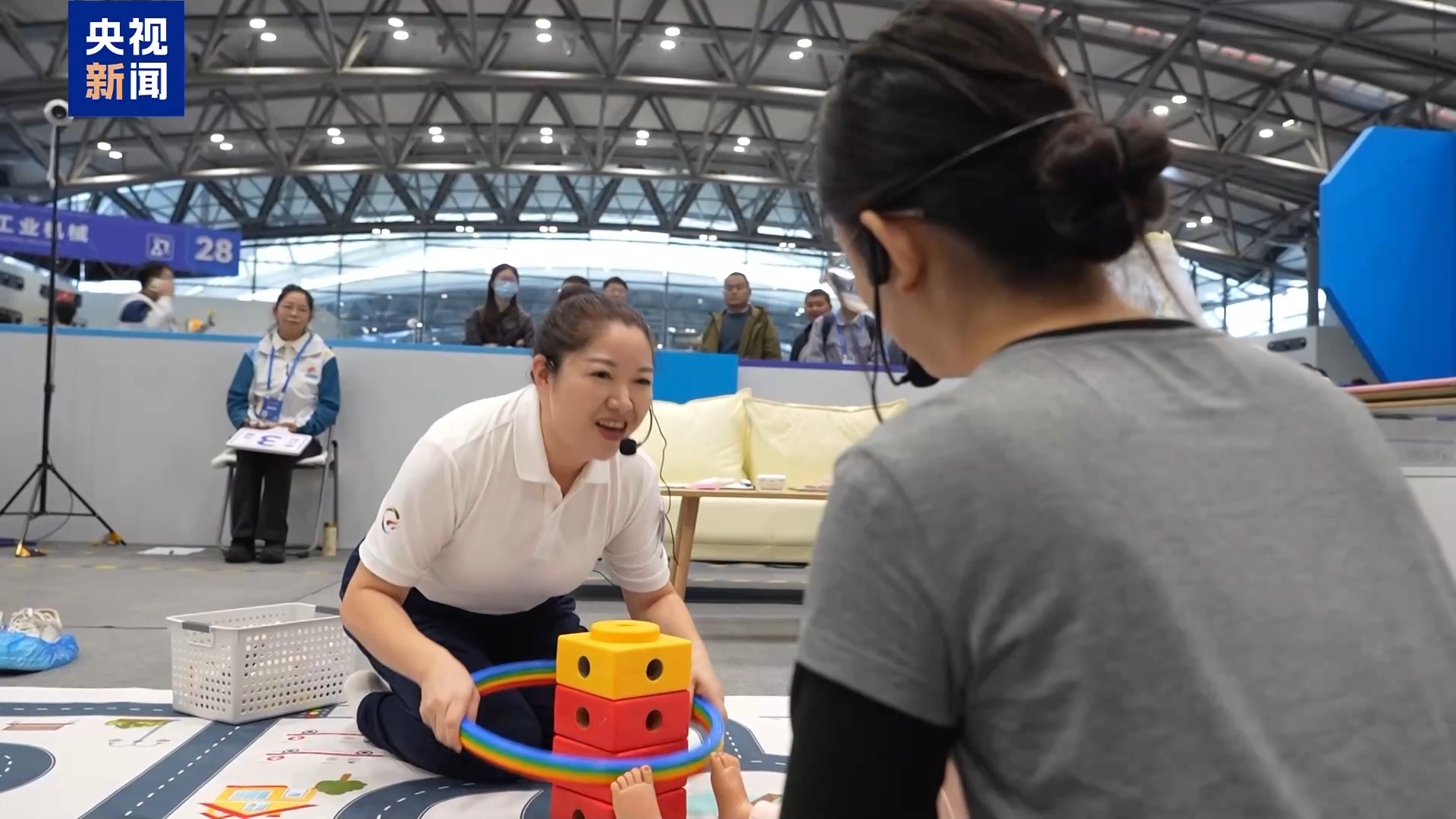 賽場上,一個個格子間按照真實居家場景布置,選手們按照流程,完成從上門拜訪、嬰兒互動、游戲設(shè)計、家長交流等系列服務(wù)工作。記者注意到,這次比賽創(chuàng)新引入會哭鬧的智能化模擬嬰兒,選手抱姿不對、饑餓都會有數(shù)據(jù)反饋,考驗選手的回應(yīng)性照顧能力,同時邀請了一些嬰幼兒家長進行配合互動。