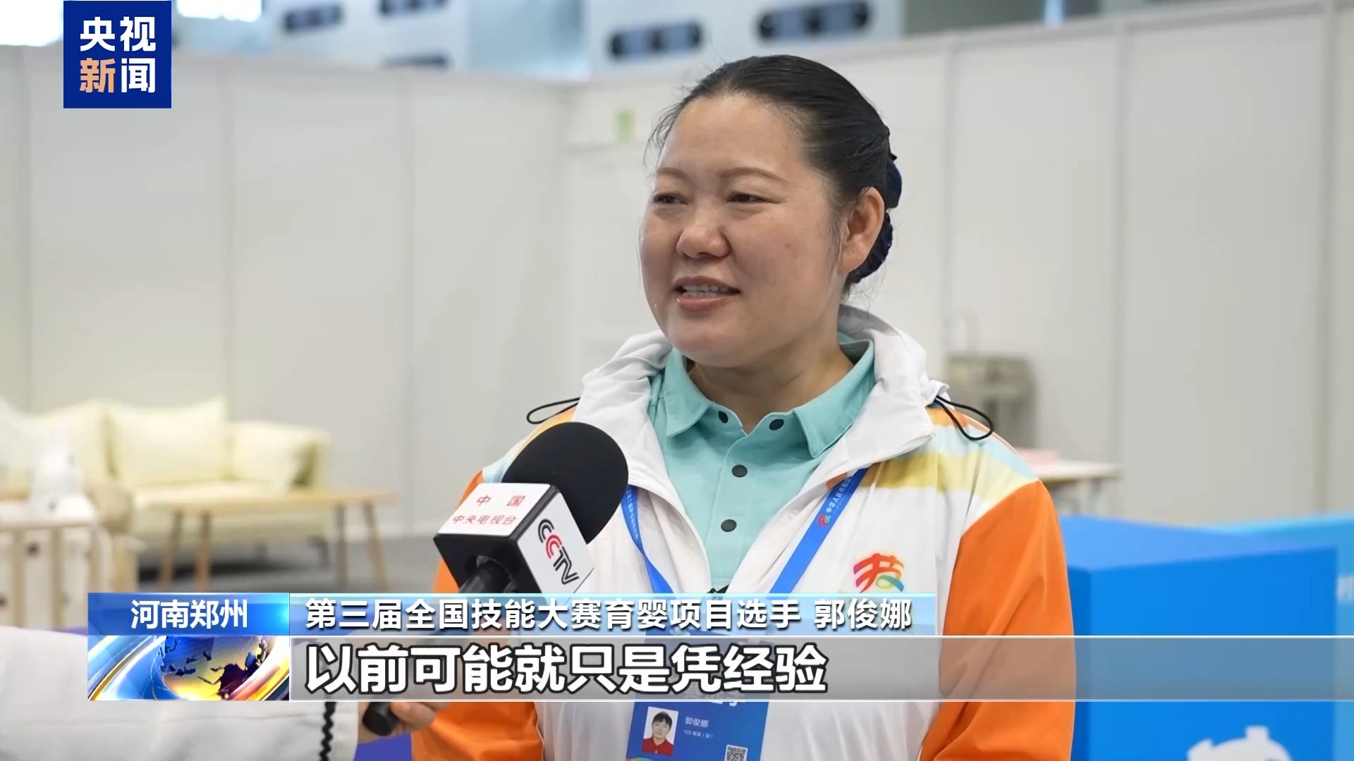 第三屆全國技能大賽育嬰項目選手 郭俊娜:比如給寶寶喂奶,以前可能只是憑經(jīng)驗,現(xiàn)在就要求抱孩子45度斜角。把流程標準化了,能夠更好地服務(wù)嬰幼兒以及家庭。