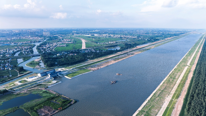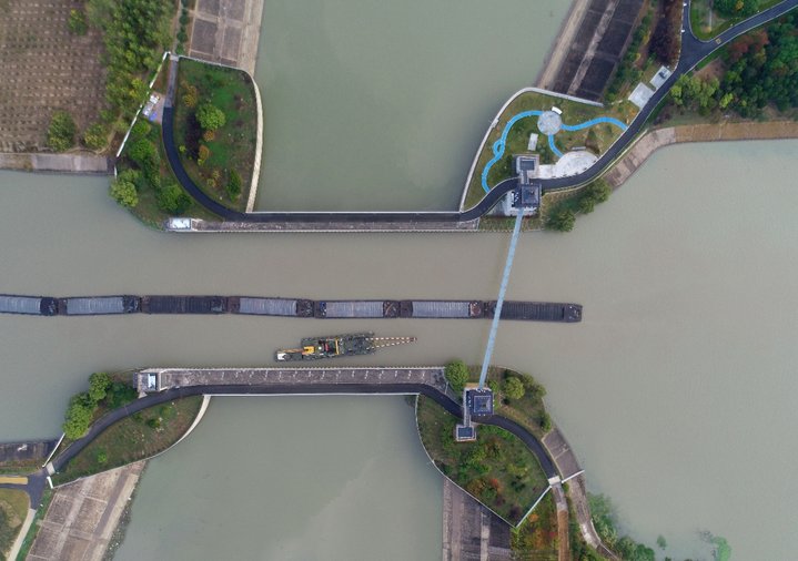 不遠(yuǎn)處的京杭大運(yùn)河上,貨船正駛過“上槽下洞”的水立交結(jié)構(gòu)。“上面是南北走向的千年運(yùn)河,下方是東西走向的淮河入海水道,這種結(jié)構(gòu)能讓行洪和航運(yùn)互不干擾?!蓖鹾橛裰赶蛐顾吹姆较?,“原來(lái)每秒2270立方米的行洪流量,二期建成后要提升到7000立方米,洪澤湖的防洪標(biāo)準(zhǔn)也從百年一遇提至三百年一遇。”