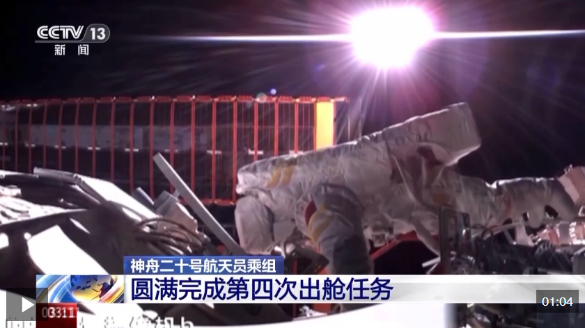 出艙活動期間,航天員陳中瑞、王杰完成了空間站空間碎片防護裝置安裝、艙外設(shè)備設(shè)施巡檢等任務(wù),這是首次由兩名第三批航天員共同完成艙外作業(yè)任務(wù)。截至目前,神舟二十號航天員乘組已完成四次出艙活動,成為我國執(zhí)行出艙任務(wù)次數(shù)最多的乘組之一。