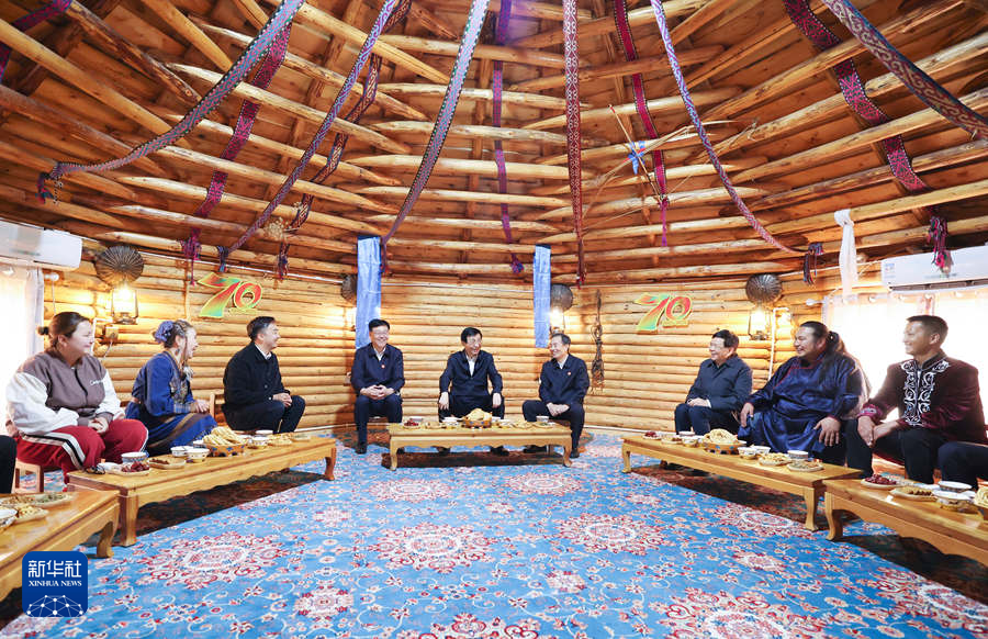 9月27日,受習近平總書記囑托,中共中央政治局常委、全國政協主席、中央代表團團長王滬寧帶領中央代表團部分成員到阿勒泰地區(qū)布爾津縣考察。這是王滬寧和中央代表團部分成員在扎拉特鄉(xiāng)村旅游專業(yè)合作社同村民交流。新華社記者 姚大偉 攝