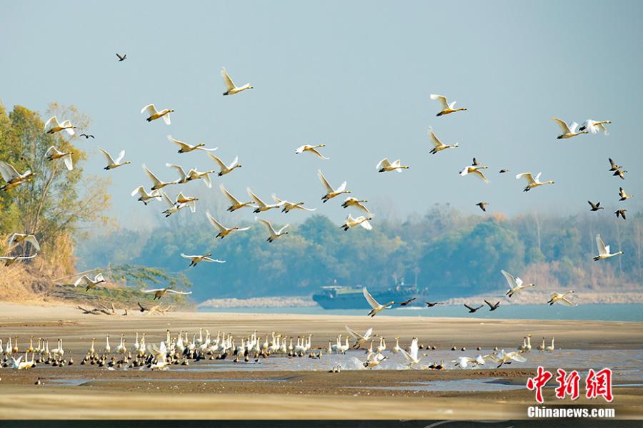 新濟(jì)洲段長(zhǎng)江沿岸,小天鵝伴隨貨物船只飛翔。園方供圖