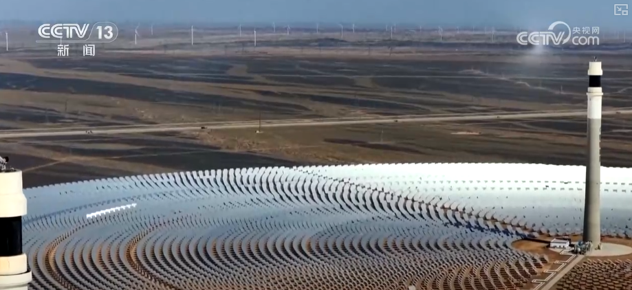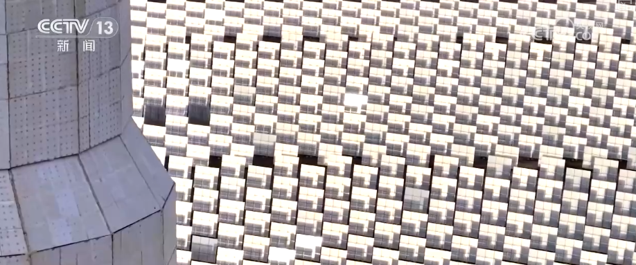 園區(qū)中,23000多面定日鏡如同一個個精準的“追光者”,通過智能控制系統(tǒng)實時追蹤太陽軌跡,將分散的太陽光集中反射到高達200多米的吸熱器上,再通過大容量熔鹽儲熱系統(tǒng),實現(xiàn)24小時連續(xù)穩(wěn)定供電。