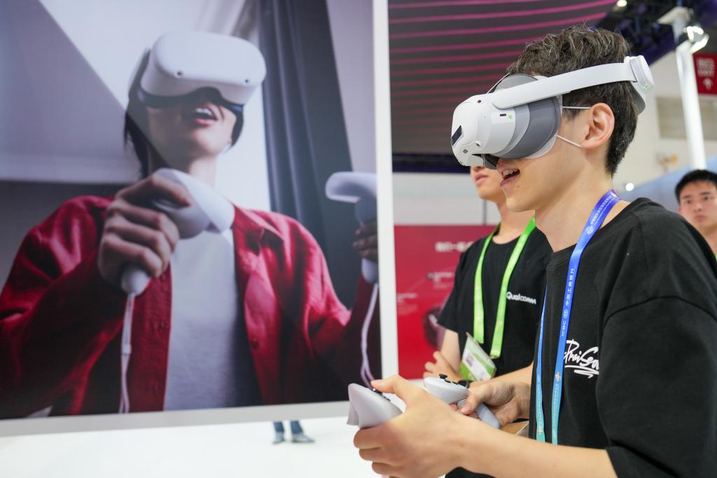 7月17日,參觀者在數(shù)字科技鏈展區(qū)高通展臺體驗搭載了高通公司芯片的產(chǎn)品。新華社記者鞠煥宗攝