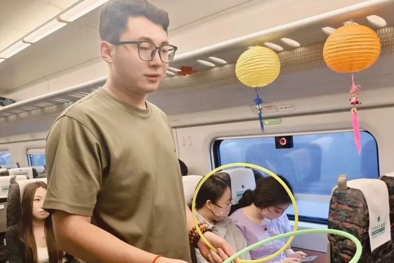 車廂內(nèi),懸掛的燈籠點綴出濃濃節(jié)日氣息。青年職工演唱歌曲《看月亮爬上來》,熟悉的旋律引發(fā)旅客共鳴;“舉頭望明月(打一中藥名)”等趣味猜燈謎活動,吸引不少旅客踴躍參與;身著漢服的乘務員帶領(lǐng)孩子們玩起傳統(tǒng)套圈游戲,月餅、玩偶作獎品,歡聲笑語不斷。