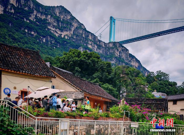 在花江村,記者看到不少游客悠閑地坐在青瓦灰墻的布依族傳統(tǒng)民居前品茶觀橋,或在村口的路邊尋找最佳角度,留下“與大橋同框”的紀(jì)念照;更有游客信步走向村邊的花江鐵索橋,尋找角度拍攝這座曾是黔滇往來要道的古橋,與遠(yuǎn)處現(xiàn)代工程的杰作形成“新老同框”的獨(dú)特畫面。