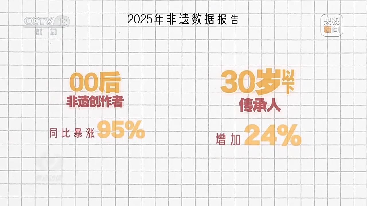 也許有人覺得這些故事太個(gè)別,所以我找到了某短視頻平臺(tái)今年的非遺數(shù)據(jù)報(bào)告,也很能說明問題。報(bào)告中提到,一年來00后非遺創(chuàng)作者同比暴漲95%,30歲以下傳承人增加24%。越來越多年輕人主動(dòng)扛起了傳承的擔(dān)子。為啥他們?cè)敢庖活^扎進(jìn)這些“老行當(dāng)”?我找到了幾位新生代代表性傳承人,試著解開這份“偏愛”背后的密碼。