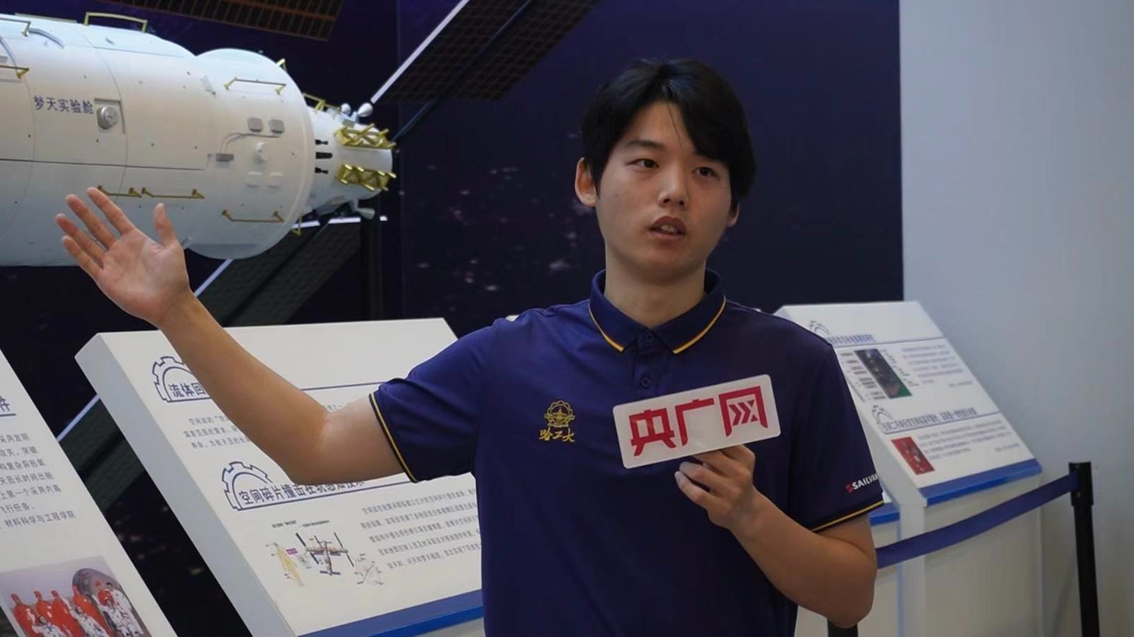 學(xué)生講解員郭鎮(zhèn)宇介紹由哈工大參與研制的問天實驗艙小機械臂(央廣網(wǎng)發(fā) 王語詩 攝)