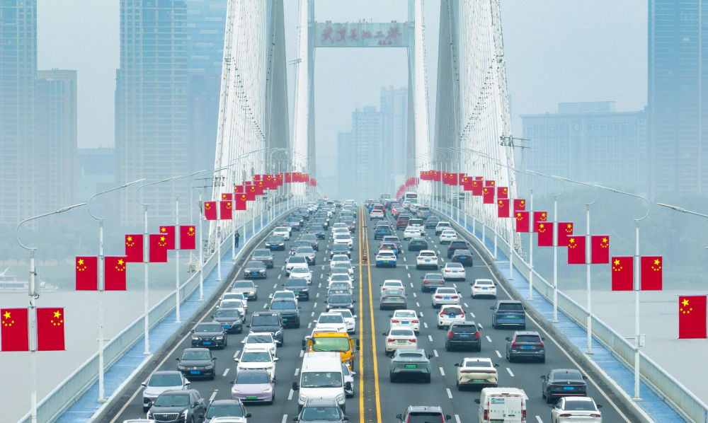 國慶假期第一天,各地迎來出行高峰。這是車輛行駛在湖北省武漢長江二橋上(無人機(jī)照片,10月1日攝)。新華社記者 肖藝九 攝