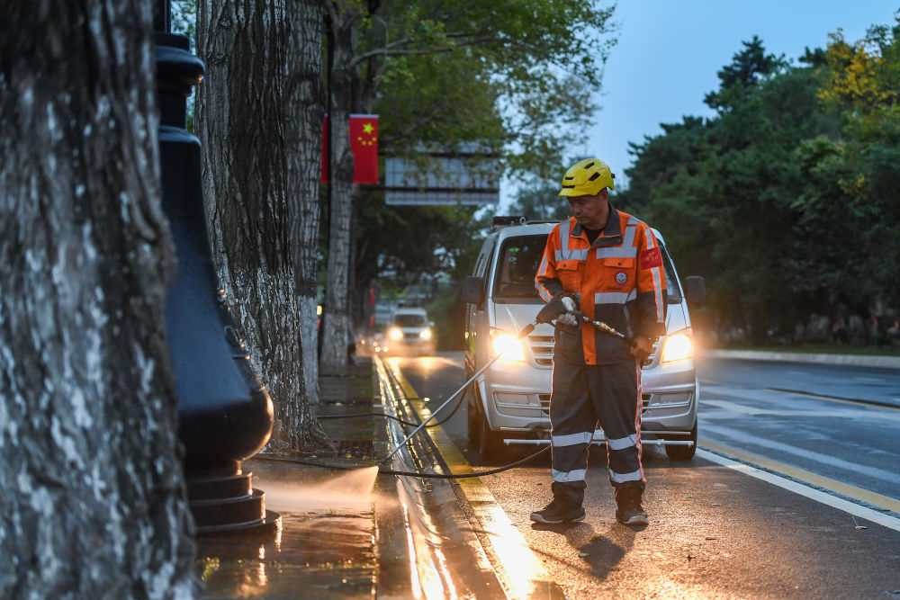 10月1日,環(huán)衛(wèi)工人在吉林省長春市朝陽區(qū)新民大街清掃人行步道。新華社記者 張楠 攝