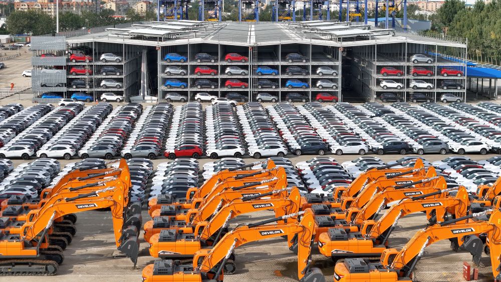 10月20日,國產(chǎn)汽車和工程機械在山東港口煙臺港集結等待裝船出口(無人機照片)。新華社發(fā)(唐克 攝)