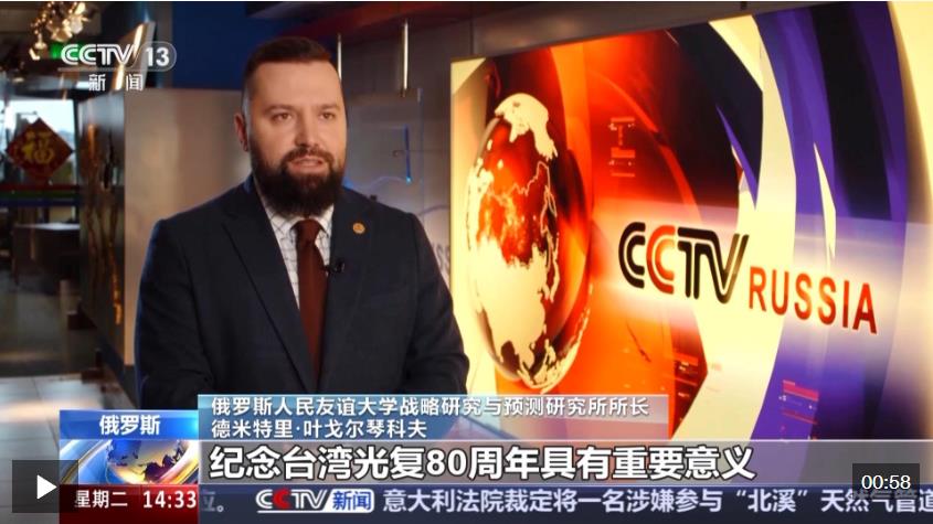 俄羅斯人民友誼大學(xué)戰(zhàn)略研究與預(yù)測研究所所長 德米特里·葉戈?duì)柷倏品颍杭o(jì)念臺(tái)灣光復(fù)80周年具有重要意義,象征著中國人民心向統(tǒng)一。戰(zhàn)勝日本軍國主義是世界反法西斯戰(zhàn)爭的重要組成部分,這一歷史應(yīng)該被銘記。