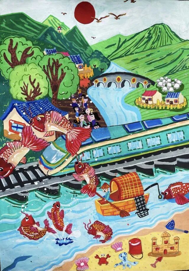 不遠(yuǎn)處徐鹽高鐵上,銀白色的高鐵像一道流星劃過(guò)水鄉(xiāng)。我的鉛筆在本子上沙沙作響,把窗外的景色畫(huà)下來(lái):成片的藕田里,粉白的荷花搖曳生姿;戴著斗笠的農(nóng)民在稻田里忙碌,身后的水渠泛著粼粼波光。列車(chē)員阿姨推著小推車(chē)走來(lái),“瓜子飲料礦泉水”的吆喝聲,和車(chē)輪與鋼軌的碰撞聲交織在一起,成為獨(dú)屬于旅途的音樂(lè)。