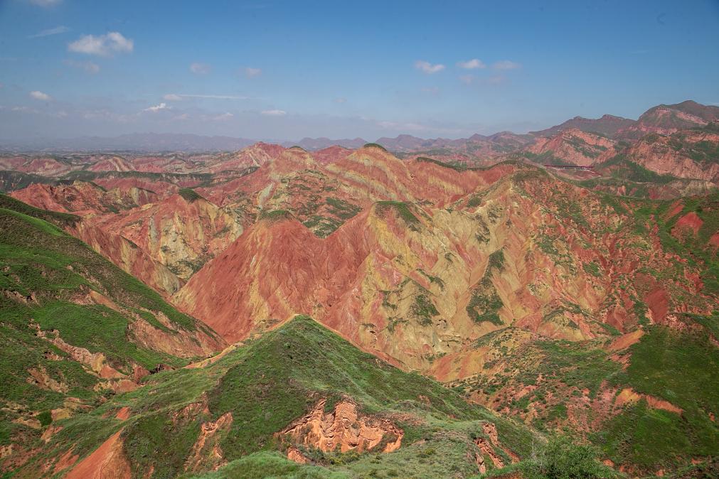 漫步景區(qū),放眼望去,紅色與青灰色交錯(cuò)分布,恍若置身于一幅水墨丹青中。移步登高,起伏的“彩丘海浪”直通天際?!叭嗽诋嬛杏危覐木爸衼??!边@是不少游客的感受。
