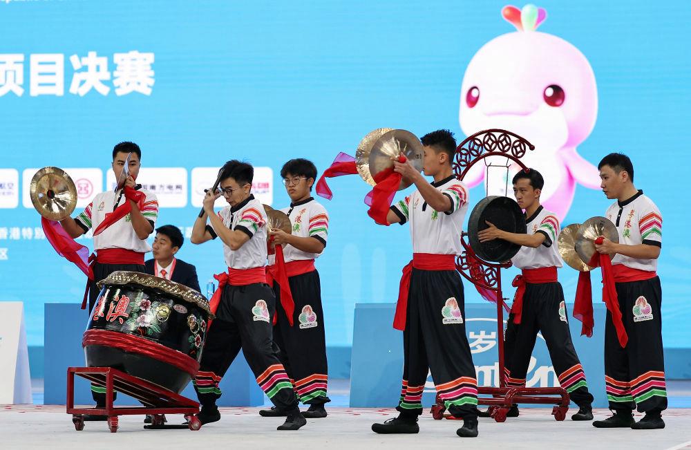 11月11日,粵港澳聯(lián)隊在第十五屆全國運動會群眾展演舞龍舞獅南獅自選項目決賽比賽中。最終,粵港澳聯(lián)隊獲得一等獎。 新華社記者 王鵬攝