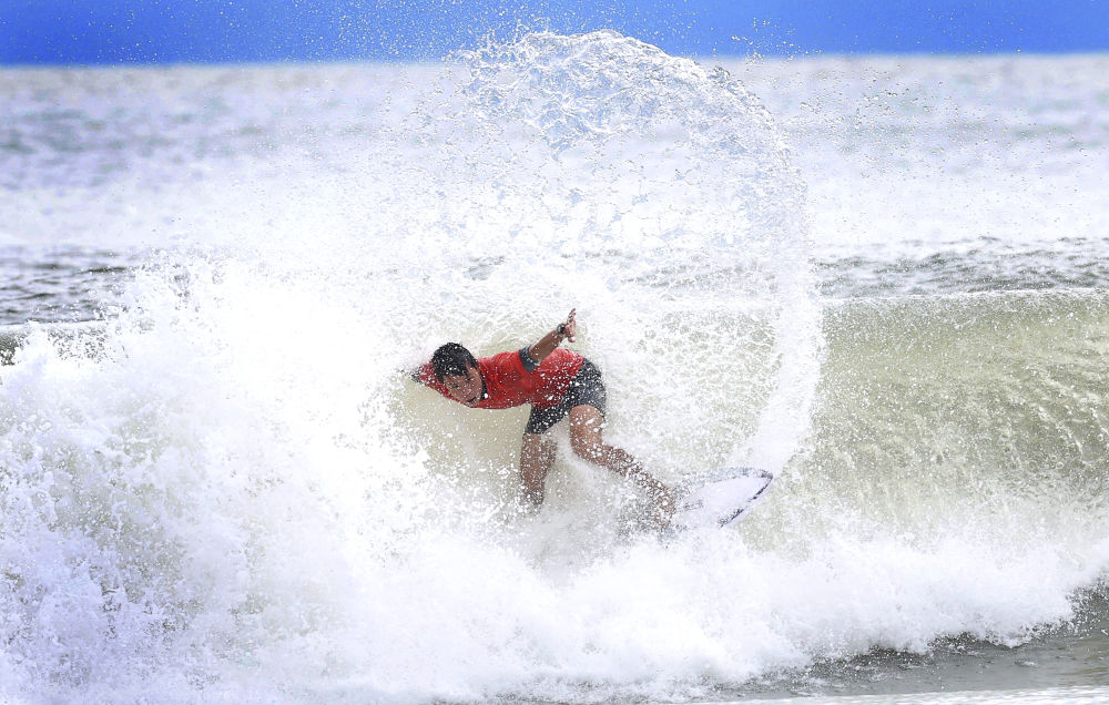 2025年11月13日,福建隊(duì)選手陳丙寅在廣東汕頭舉行的第十五屆全國運(yùn)動(dòng)會(huì)沖浪男子短板第一輪比賽中。新華社記者盧漢欣攝