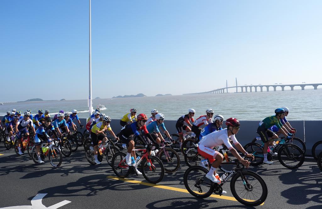 ↑11月8日,第十五屆全國(guó)運(yùn)動(dòng)會(huì)公路自行車(chē)男子個(gè)人賽決賽開(kāi)賽,全程231.8公里,選手將經(jīng)過(guò)港珠澳大橋,跨越粵港澳三地。新華社記者 顏麟蘊(yùn) 攝