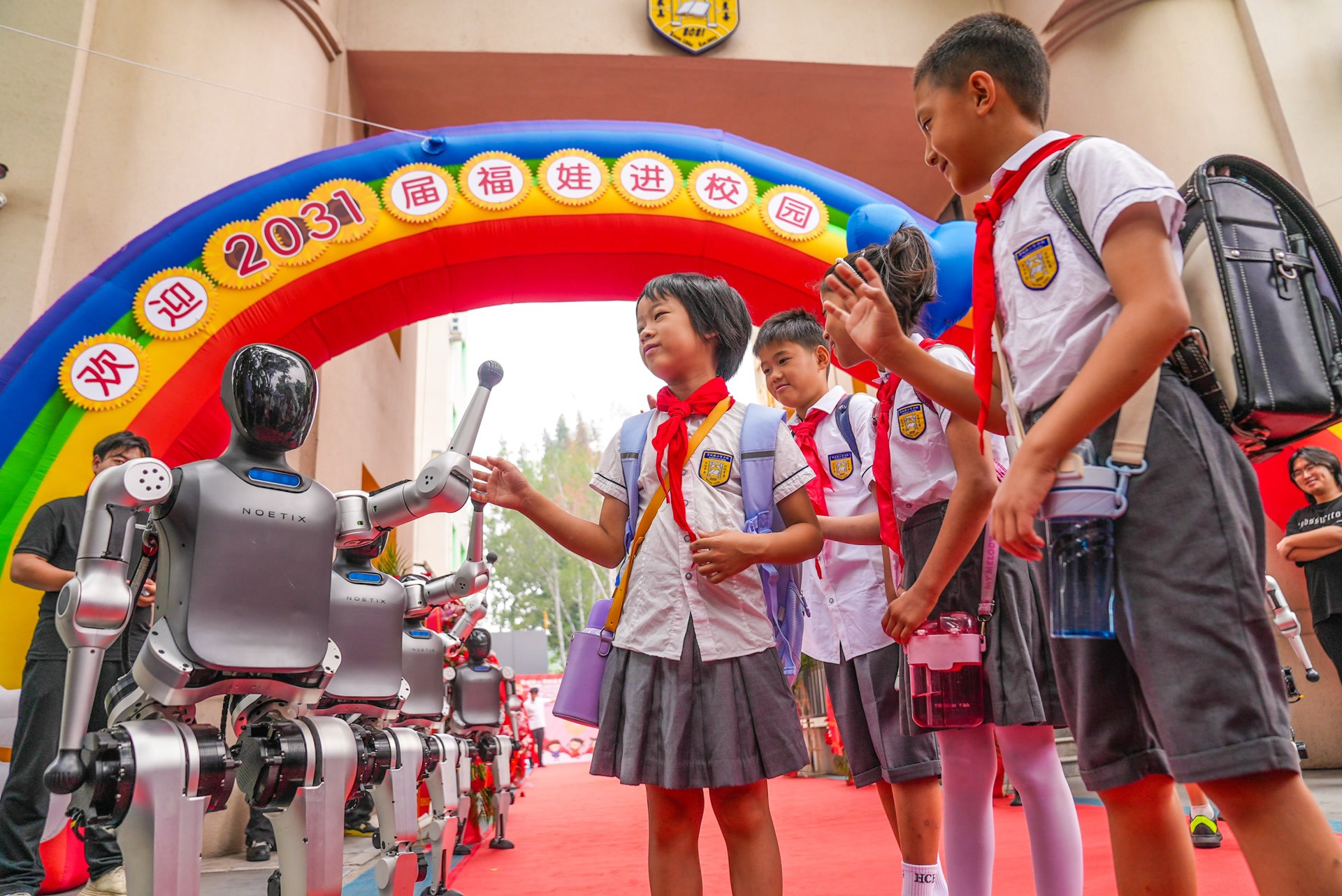 智能機(jī)器人與師生共迎新學(xué)期。