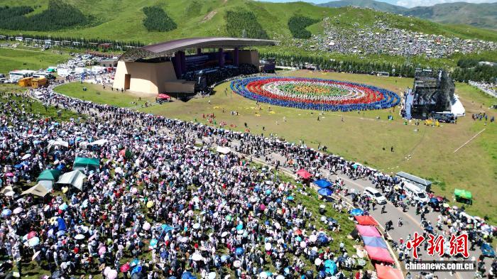 2024年8月4日,第22屆九色甘南香巴拉旅游藝術節(jié)在甘肅省甘南藏族自治州當周草原開幕。圖為開幕式現(xiàn)場鍋莊舞表演。(資料圖)九美旦增 攝