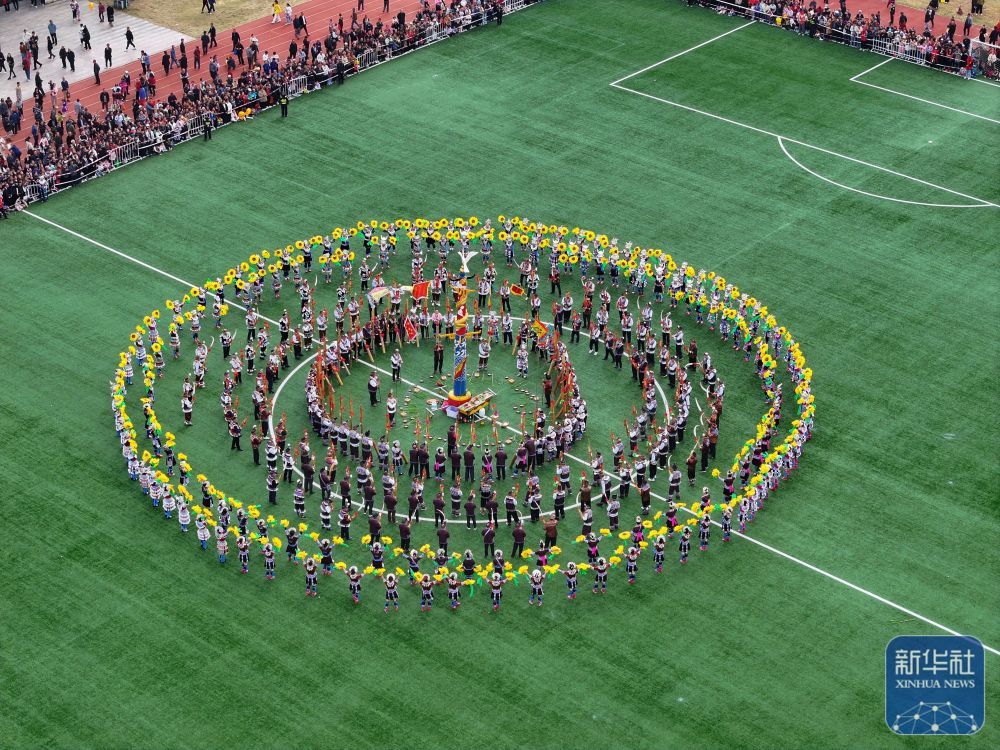 ↑11月29日,表演者在融水縣民族體育公園舉行的蘆笙斗馬節(jié)開幕式現(xiàn)場表演蘆笙踩堂(無人機(jī)照片)。新華社發(fā)(鄭昌昊攝)