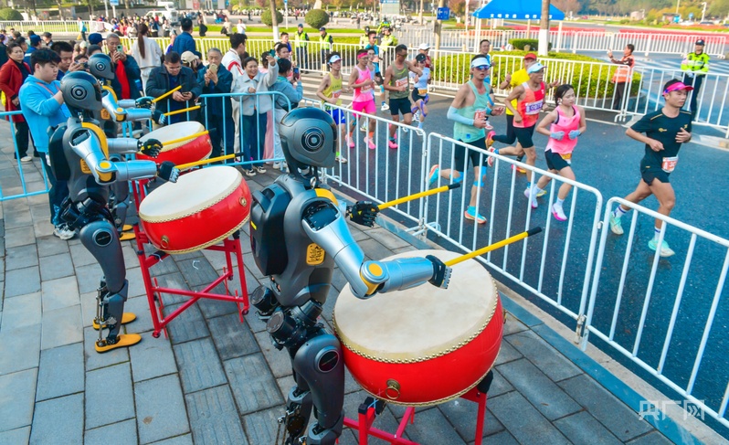 光谷馬拉松現(xiàn)場,人形機器人為選手加油(央廣網(wǎng)發(fā) 光谷馬拉松組委會供圖)