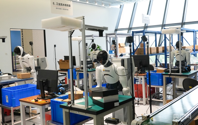 人形機器人在工業(yè)流水線場景中進行動作訓練(央廣網(wǎng)記者鄧子依 攝)