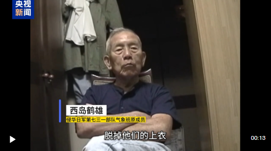 侵華日軍第七三一部隊(duì)氣象班原成員 西島鶴雄:脫掉他們的上衣,讓他們光著身子,放在零下20攝氏度甚至零下25攝氏度的環(huán)境里,放5分鐘或10分鐘。