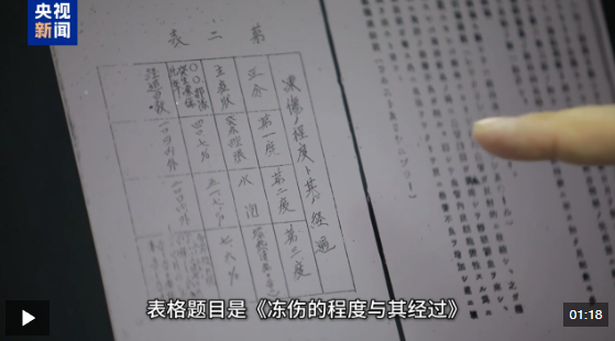 侵華日軍第七三一部隊(duì)罪證陳列館研究人員 譚天:這就是論文里的一張表格。表格題目是《凍傷的程度與其經(jīng)過》。第一度,發(fā)紅腫脹,第二度,出現(xiàn)水皰,第三度,壞死,含潰瘍。第三度,它這里頭寫五十到六十天,腳趾、手指脫落。無疑,這是經(jīng)過大量人體實(shí)驗(yàn),得到的所謂的數(shù)據(jù)。
