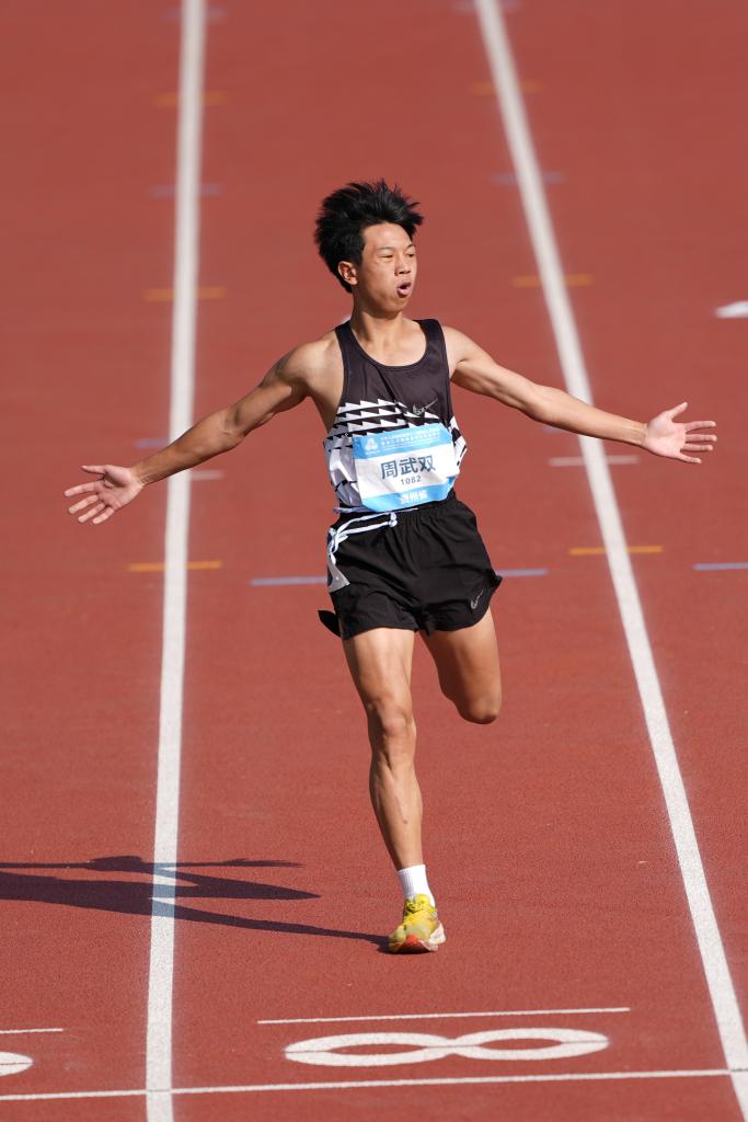 12月12日,貴州隊(duì)選手周武雙在男子12-15歲組400米預(yù)賽第4組比賽中,即將沖過終點(diǎn)時(shí)慶祝。新華社記者 楊晨光 攝