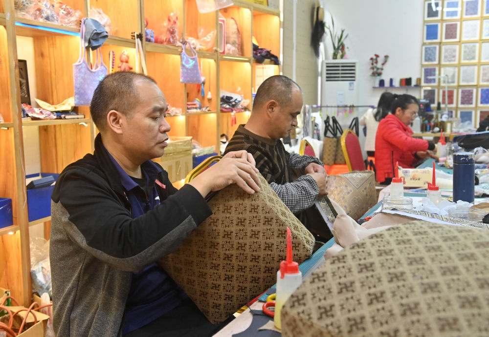 在廣西賓陽壯錦文創(chuàng)館,工人制作壯錦文創(chuàng)產品。廣西賓陽縣有著悠久的壯錦生產歷史。近年來,該縣在傳統(tǒng)壯錦生產的基礎上,積極推動壯錦文創(chuàng)產業(yè)發(fā)展,拓寬了當地勞動就業(yè)渠道。新華社記者 陸波岸 攝