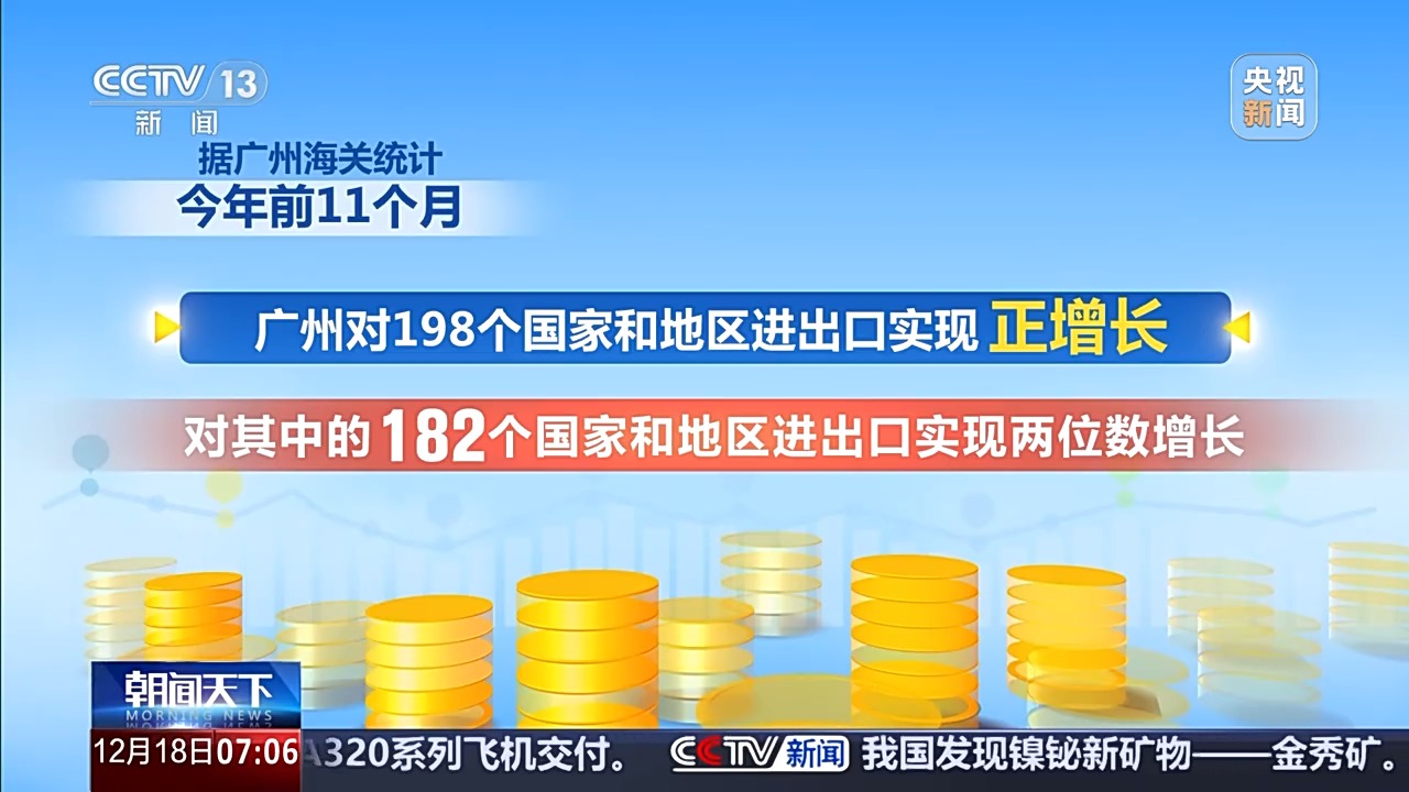 據(jù)廣州海關(guān)統(tǒng)計,今年前11個月,廣州對198個國家和地區(qū)進(jìn)出口實現(xiàn)正增長,對其中的182個國家和地區(qū)進(jìn)出口實現(xiàn)兩位數(shù)增長。