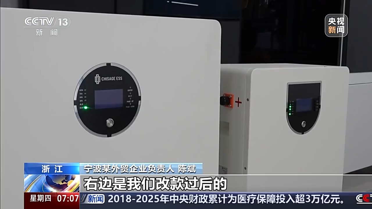 寧波某外貿(mào)企業(yè)負(fù)責(zé)人 陳斌:左邊的這個產(chǎn)品是我們原來的舊產(chǎn)品,右邊是我們改款過后的,相比原來的產(chǎn)品,新產(chǎn)品重量減少了15%左右,體積減小了25%左右,它的能量密度就更高了,在市場上就具有更好的競爭力。