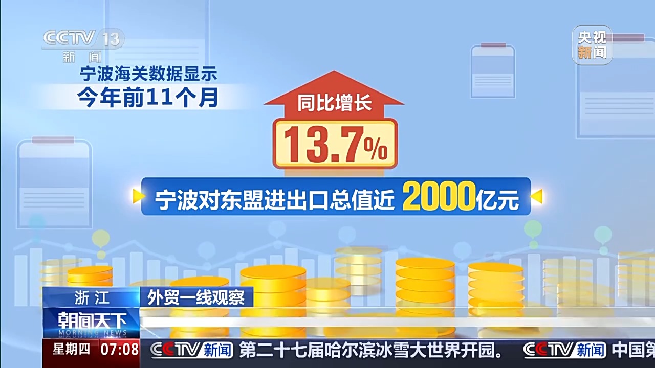 寧波海關(guān)數(shù)據(jù)顯示,今年前11個月,寧波對東盟進(jìn)出口總值近2000億元,同比增長13.7%。其中,機(jī)電產(chǎn)品作為寧波對東盟出口商品中的主力軍,前11個月出口了近600億元,增長22.9%。