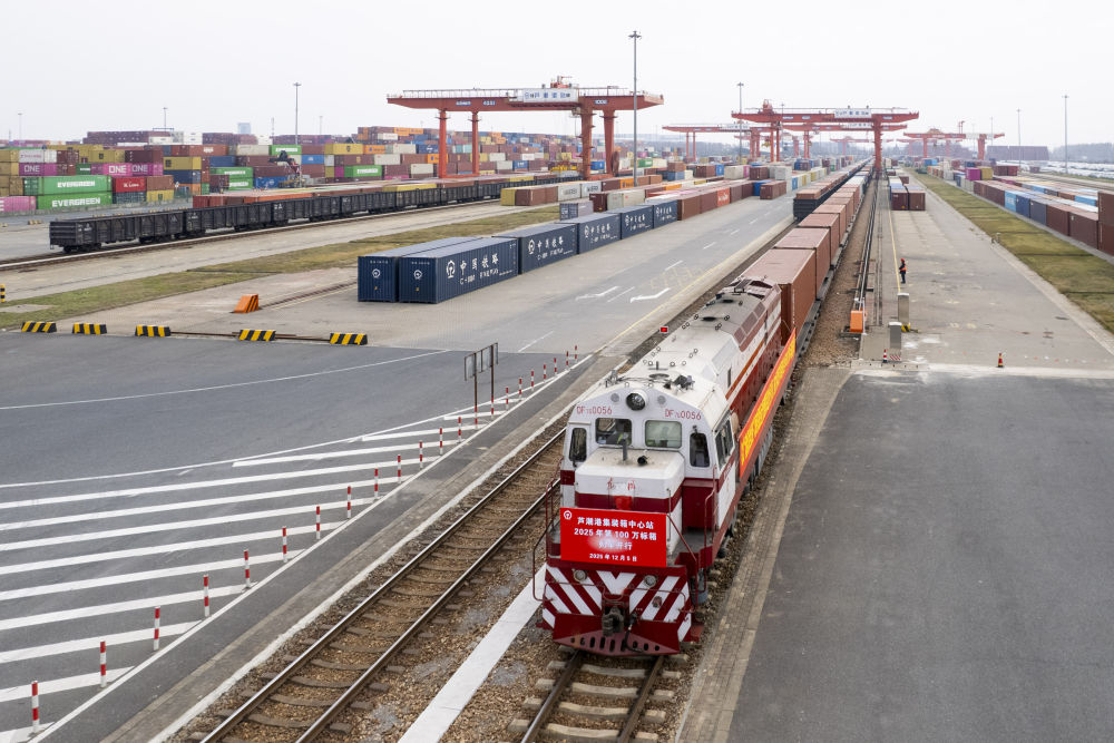2025年12月5日拍攝的上海鐵路蘆潮港集裝箱中心站(無人機(jī)照片)。當(dāng)日上午,一趟載有太陽能光伏組件、汽車零配件等貨物的海鐵聯(lián)運班列緩緩從上海蘆潮港集裝箱中心站開出,上海海鐵聯(lián)運年度業(yè)務(wù)量首次跨越百萬標(biāo)箱大關(guān)。新華社記者 王翔 攝