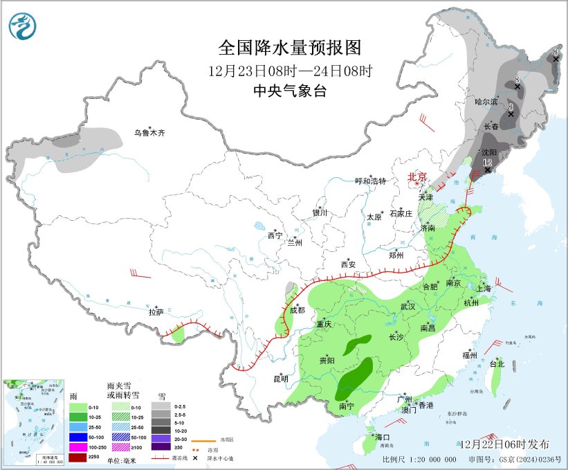 12月23日08時至24日08時,東北地區(qū)、新疆南疆西部山區(qū)、華北東部、山東北部等地部分地區(qū)有小到中雪或雨夾雪,其中,黑龍江中東部、吉林中部、遼寧東部局地大到暴雪(10~12毫米)。黃淮東部、江淮、江漢大部、江南北部和西部、西南地區(qū)東部、廣西、廣東東南部沿海、海南島東部、臺灣島東部等地部分地區(qū)有小雨,其中,湖南西部、貴州東北部、廣西中部等地部分地區(qū)有中雨。內(nèi)蒙古中東部、遼東半島、西藏中北部等地部分地區(qū)有4~6級風;渤海、渤海海峽、黃海大部海域、東海西部海域、臺灣海峽、巴士海峽、南海北部海域?qū)⒂?~7級大風、陣風8~9級。