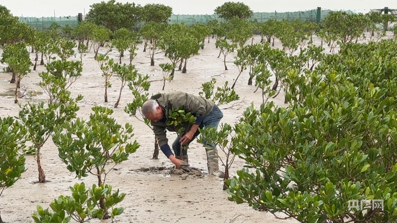 吳昌根輕輕地將灘涂上倒伏的紅樹(shù)幼苗扶正(央廣網(wǎng)記者 李曉曉 攝)