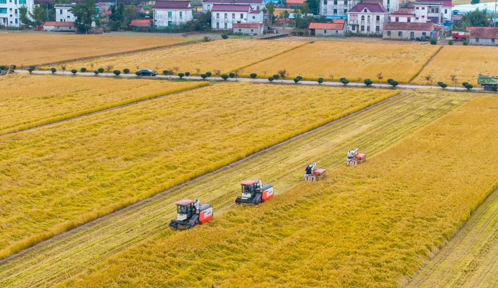 2025年10月30日,在江蘇省南通市通州區(qū)十總鎮(zhèn)育民村高標(biāo)準(zhǔn)農(nóng)田里,村民駕駛農(nóng)機(jī)收割水稻(無人機(jī)照片)。新華社發(fā)(翟慧勇攝)