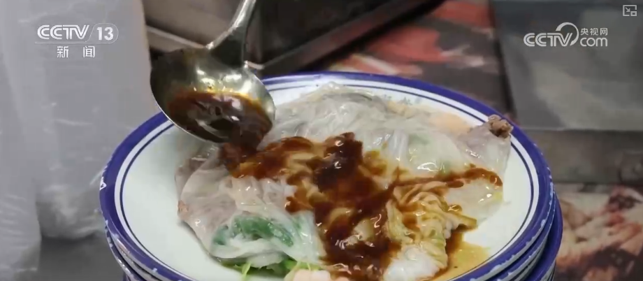 腸粉的做法并不復(fù)雜,在蒸盤上均勻澆上一層米漿,加入肉類、青菜等配料,大火蒸制1分鐘后迅速取出。薄而透亮的米皮包裹著肉、雞蛋、青菜等餡料,再淋上特制鹵水,一份色、香、味俱全的腸粉就制作好了。