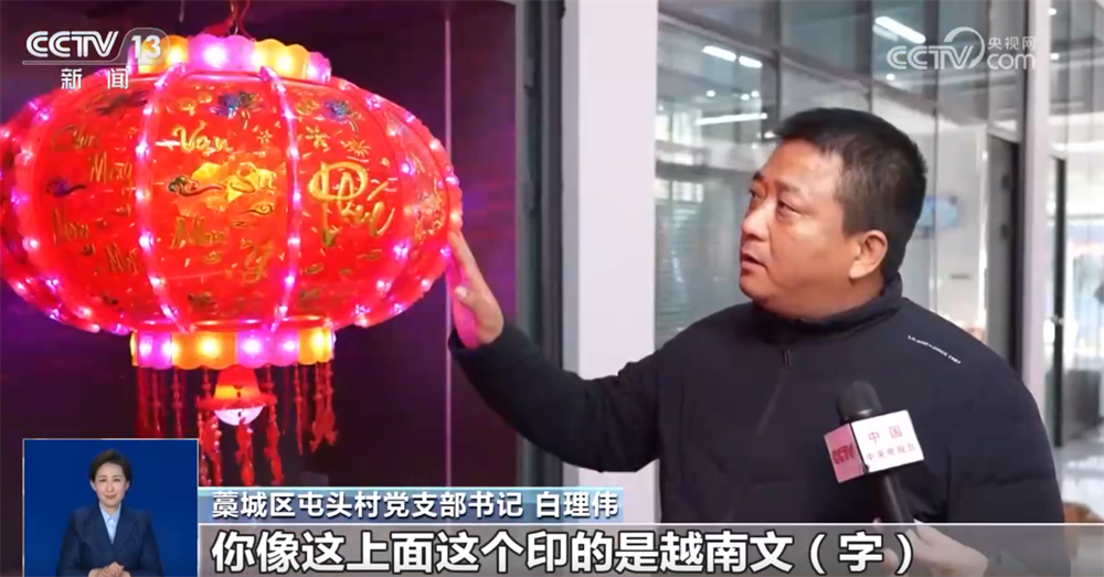 藁城區(qū)屯頭村黨支部書記 白理偉:通過宮燈博覽會(huì),對(duì)接了市場(chǎng)、增加了客戶,你像這個(gè)上面印的是越南文字,一些吉祥話,這是近兩年新開發(fā)的產(chǎn)品。