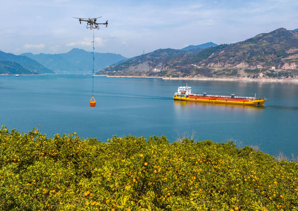 2025年3月17日,湖北省秭歸縣郭家壩鎮(zhèn)鄧家坡村村民用無人機轉(zhuǎn)運臍橙(無人機照片)。新華社發(fā)(鄭家裕攝)