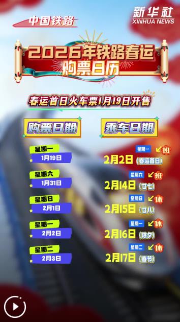 記者1月18日從中國(guó)國(guó)家鐵路集團(tuán)有限公司獲悉,2026年鐵路春運(yùn)自2月2日開(kāi)始,至3月13日結(jié)束,為期40天,全國(guó)鐵路預(yù)計(jì)發(fā)送旅客5.39億人次,節(jié)前客流高峰日預(yù)計(jì)為2月13日(臘月廿六),節(jié)后客流高峰日預(yù)計(jì)為2月23日(正月初七),春運(yùn)首日火車(chē)票將于1月19日開(kāi)始發(fā)售。