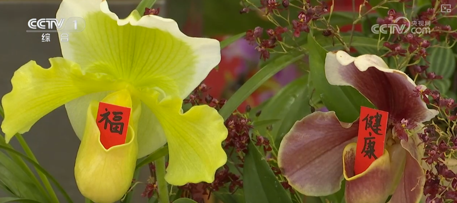 在北京花卉交易中心,各色年宵花爭奇斗艷。其中,新品蘭花“兜蘭”十分惹眼,獨特的兜形花瓣里,被放入“順?biāo)臁薄敖】怠钡淖8?ㄆ?,寓意“兜住順?biāo)臁薄岸底〗】怠?,祝福滿滿,年味十足。