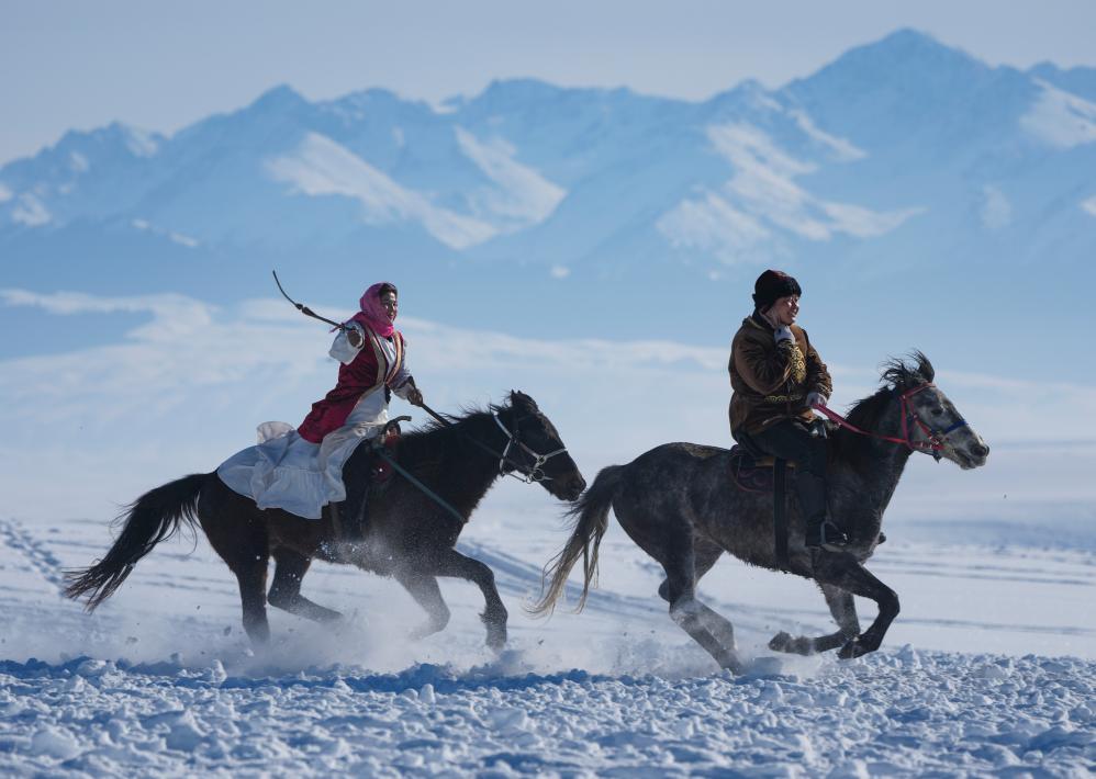 西陲天山,雪峰逶迤。被譽(yù)為“天馬故鄉(xiāng)”的新疆伊犁昭蘇縣,在南腔北調(diào)的歡呼聲中,演員們騎馬行進(jìn)在銀裝素裹的濕地公園,載歌載舞表演牧區(qū)傳統(tǒng)婚禮。興之所起,游客與演員共舞一曲,熱鬧非凡。